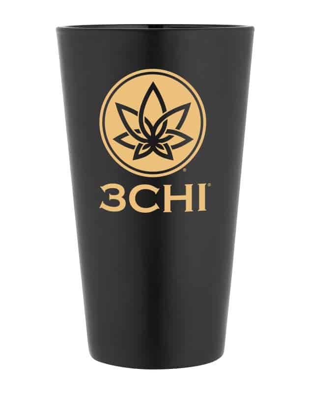 Represent your favorite brand with a 3CHI pint glass. Black pint glass with gold 3CHI medallion logo and print “3CHI”.