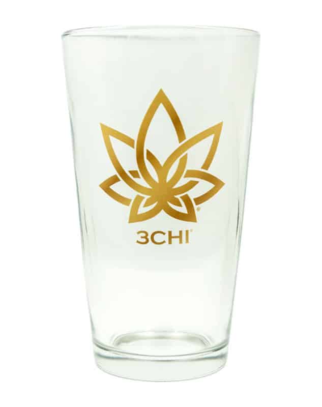 Represent your favorite brand with a 3CHI pint glass. Clear pint glass with gold 3CHI hemp flower logo and print “3Chi”.